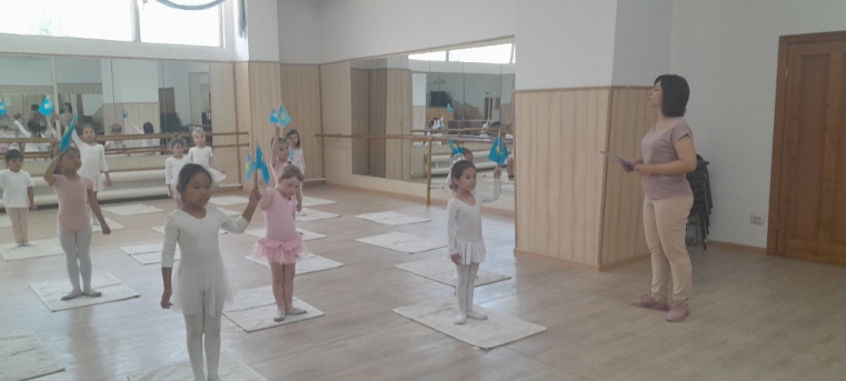 Облыстық балет мектебінің «Тәуелсіз еліміздің рәміздері» атты мерекелік шара барысында атқарылған жұмыс. Жалпы мақсаты: Білімділігі: Балаларға ҚР-ның рәміздерімен таныстыру елтаңба, ту, әнұран туралы түсінік қалыптастыру. Туған ел, Отан туралы білімдерін кеңейту. Дамытушылығы: Сөздік қорларын молайту,байланыстырып сөйлеуге үйрету берілген сұрақтарға жауап беруге үйрету. Тәрбиелігі: Отан сүйгіштікке баулу, елін, жерін құрметтеуге тәрбиелеу.Әдіс-тәсілі: Әнұран тыңдау, шаттық шеңбер, түсіндіру, көрсету, тақпақтар айту,сергіту сәті.