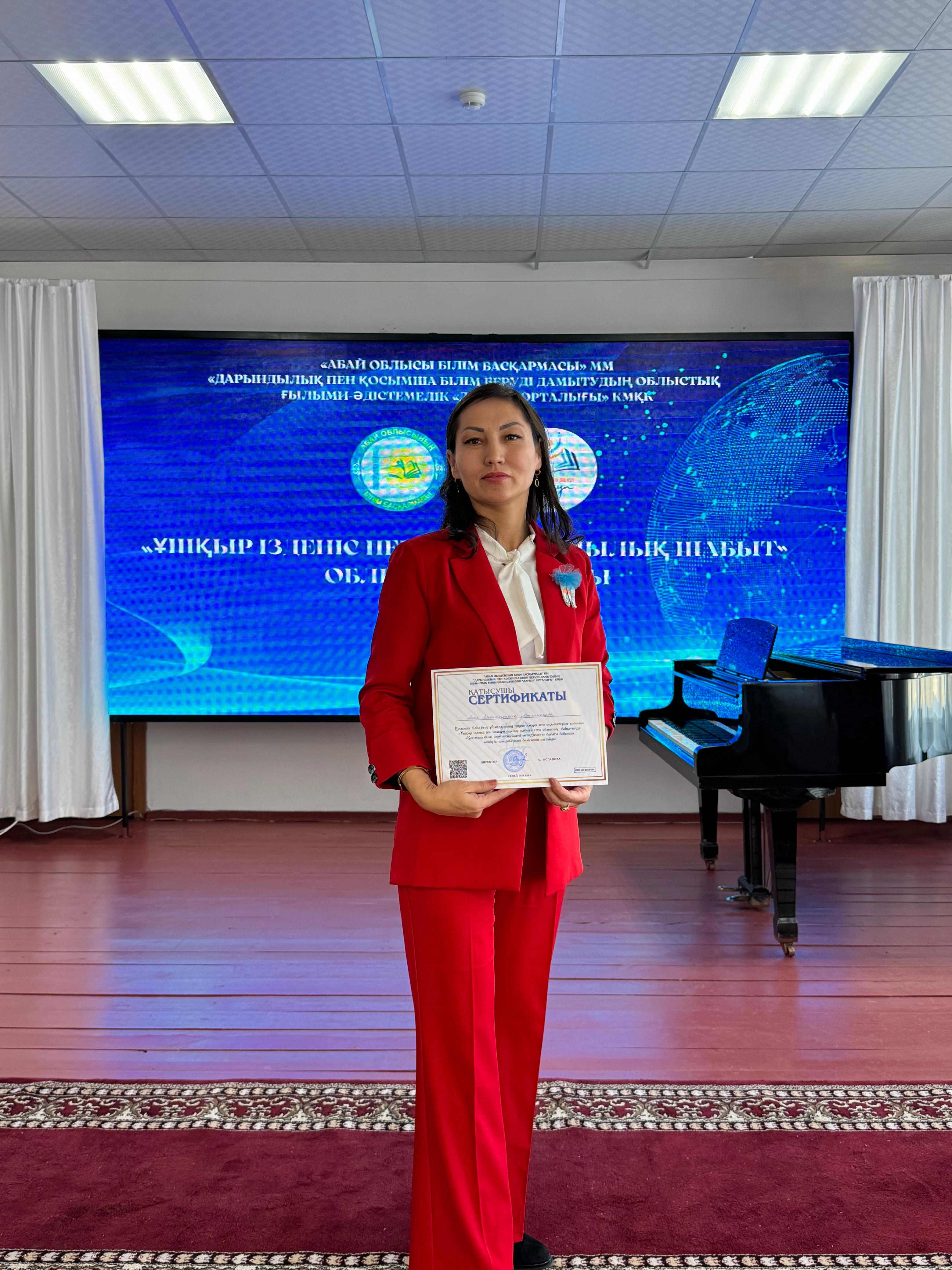 Облыстық байқауға қосымша білім беру ұйымдарының басшылары мен педагогтері қатысты. Байқаудың қорытындысы әділқазы алқаларының ортақ шешімімен анықталды. Екі бағыт бойынша «Бас жүлде» иегерлеріне оқу-ағарту, ғылым және жоғары білім қызметкерлерінің салалық кәсіптік одағының” Абай облысының кәсіподақ ұйымы” қоғамдық бірлестігі жаз айларына Алакөл демалыс аймағына жолдама сыйлады. Жүлделі орын алған қатысушылар ақшалай және бағалы сыйлықтармен марапатталды. Осы байқауға Облыстық балет мектебінің директоры Муслиманова Анар Амангельдыевна да қатысып, өзінің «Қосымша білім беру жүйесіндегі менеджмент» бағыты бойынша өзінің іс-тәжірибесімен бөлісіп, ҚАТЫСУШЫ СЕРТИФИКАТЫМЕН марапатталды.